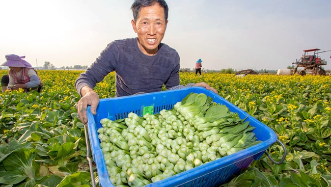 在河南柘城县安平镇杨家菜园供广深港蔬菜产业园内,近百名工人忙着采摘新鲜的蔬菜,打包好的蔬菜将通过冷链运输销往广州、深圳和香港等地。