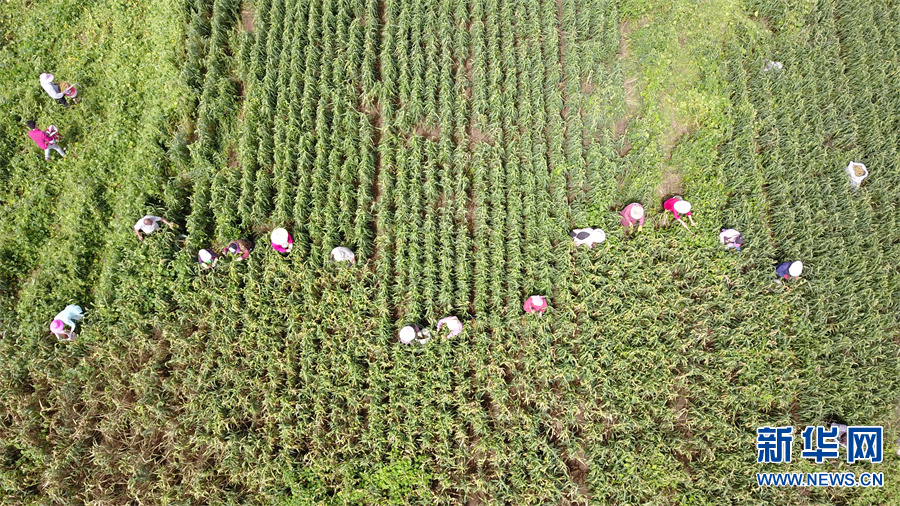 河南省洛阳市汝阳县内埠镇内埠村千亩优质谷子种植基地,村民在谷子地收割谷子(无人机照片)。