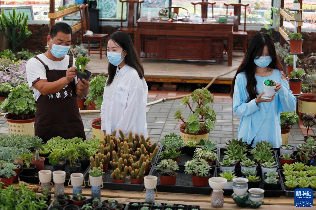 8月31日,游客在河南省宝丰县龙王沟乡村振兴示范区多肉种植园挑选多肉植物。新华社发(何五昌 摄)