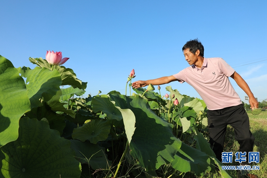河南省焦作市温县岳村,一农民在莲鱼共养基地进行管护。