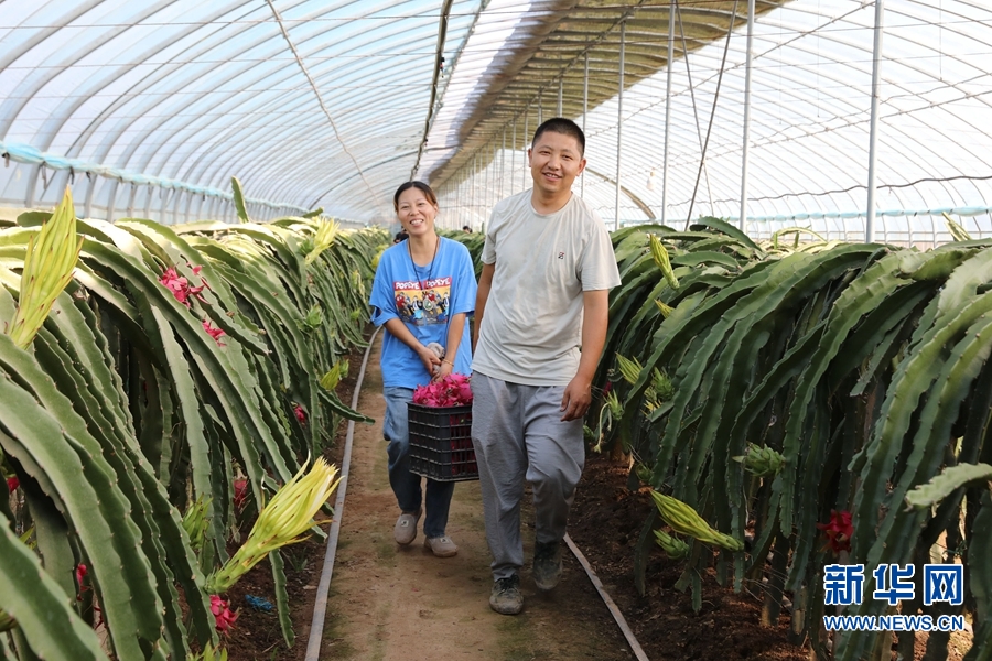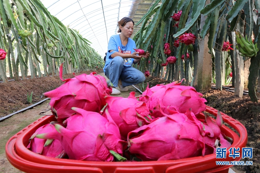 在河南省焦作市温县温泉街道觉世头村火龙果采摘园,农户在大棚内采收火龙果。
