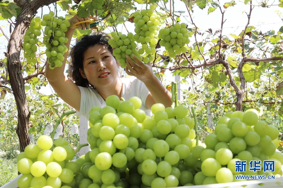 河南省焦作市温县北冷村村民陈素兰在采收葡萄。