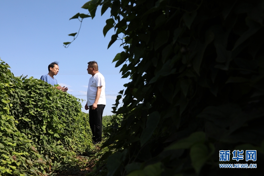 河南省焦作市温县武德镇苏王村,高级农艺师刘永康(左)指导农户山药中后期管理技术。