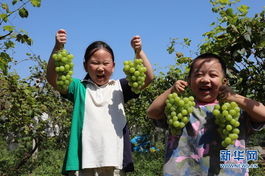 两名小朋友在河南省焦作市温县北冷村葡萄采摘园体验采收葡萄的乐趣。