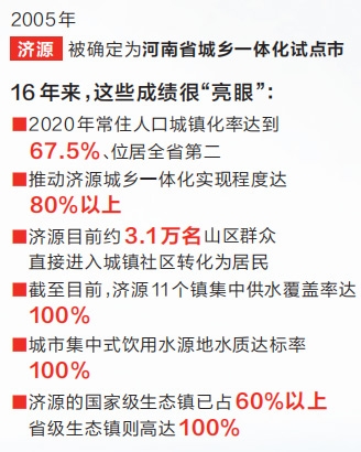 在推进新型城镇化建设的道路上,济源已经走过了16年。自2005年被确定为河南省城乡一体化试点市以来,济源新型城镇化建设快速推进,2020年常住人口城镇化率达到67.5%、位居全省第二,推动济源城乡一体化实现程度达80%以上。
