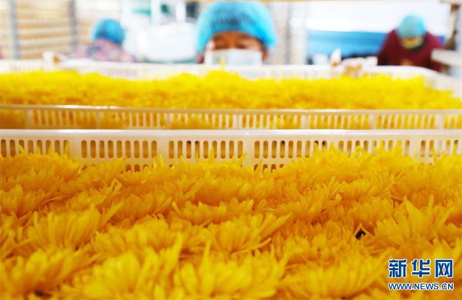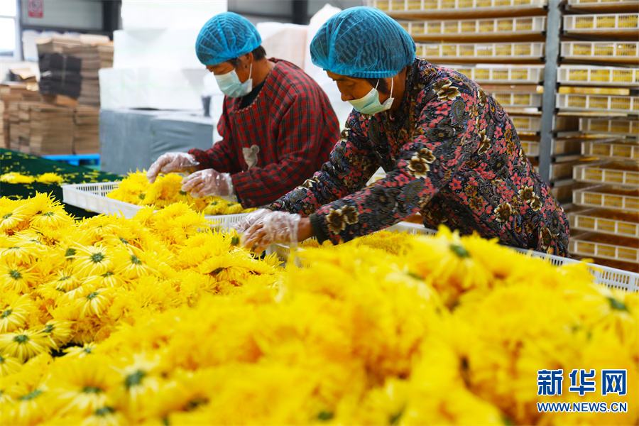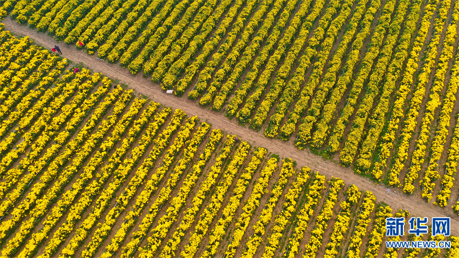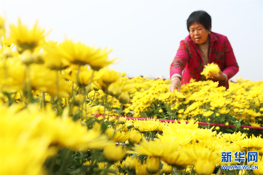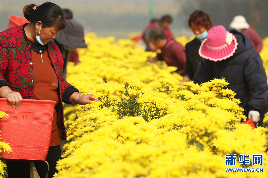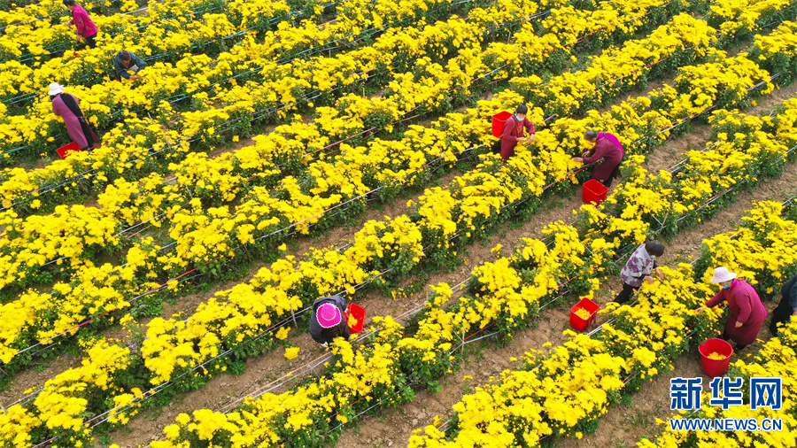 河南许昌,村民在鄢陵县张桥镇裴庄村金丝皇菊种植基地采摘菊花。