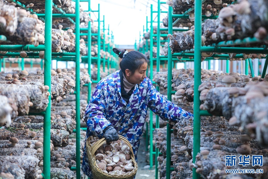 河南省信阳市光山县十里镇徐寺村,村民正在食用菌栽培基地采摘花菇。