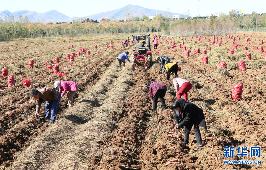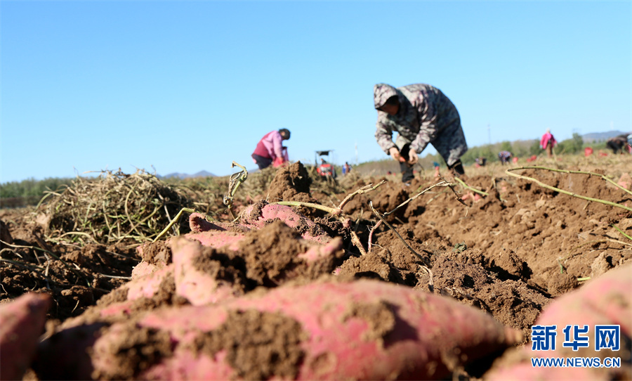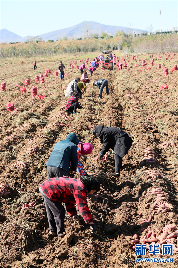 河南省汝阳县小店镇小寺村千亩优质红薯种植基地,农民在收获红薯。